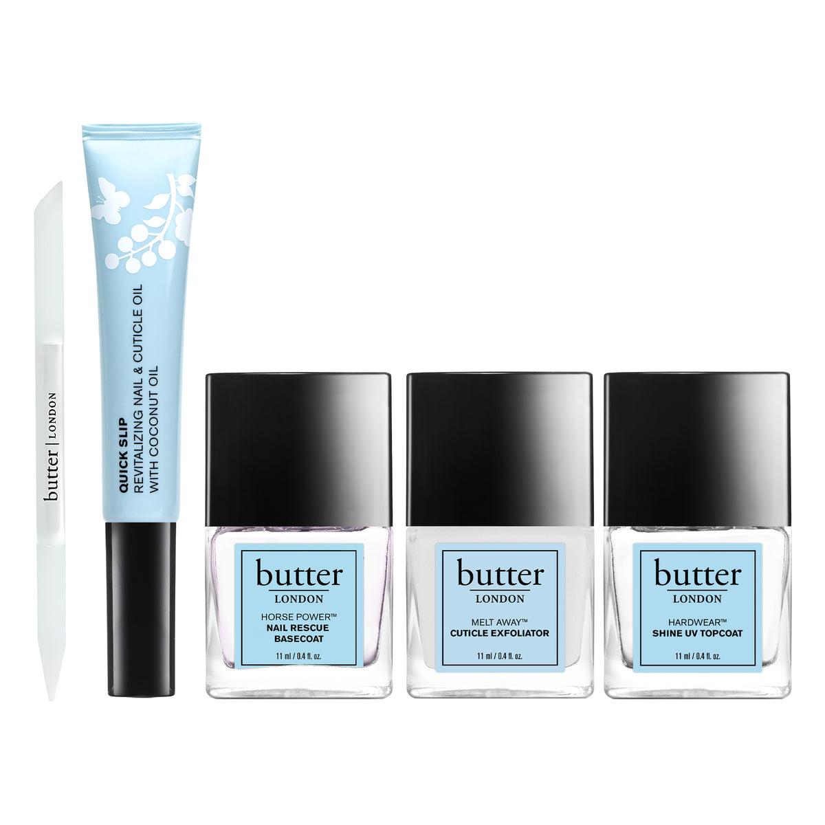 Get healthy-looking nails with this butter LONDON five-piece classic treatment set. The collection includes everything you need for perfectly manicured cuticles and nails, including the Signature Glass Cuticle Pusher and Melt Away Cuticle Exfoliator. Apply Horse Power Nail Rescue Basecoat before Hardwear Shine Topcoat for an ultra-glossy manicure. Indulge your cuticles with Quick Slip Revitalizing Nail & Cuticle Oil with Coconut Oil as the final step of any manicure.