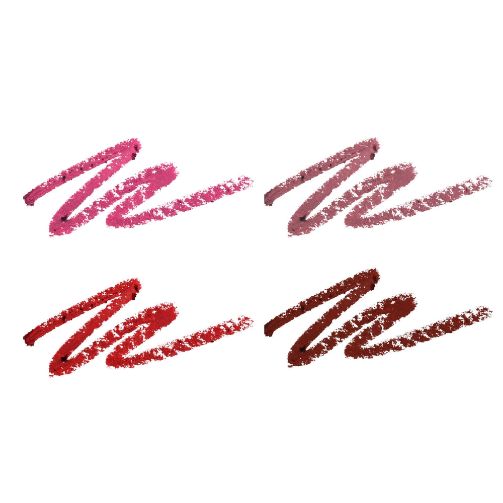 Define, shape, and perfect every pout with this must-have lip liner set. Featuring four versatile shades, Spiced Wine (deep, sultry wine), Red Hot (classic rich red), Sensual Nude (soft, everyday nude), and Sizzle Pink (vibrant electric pink), these liners glide on smoothly for precise, long-lasting color. Perfect for pairing with your favorite lipsticks or wearing solo for a bold, defined look.