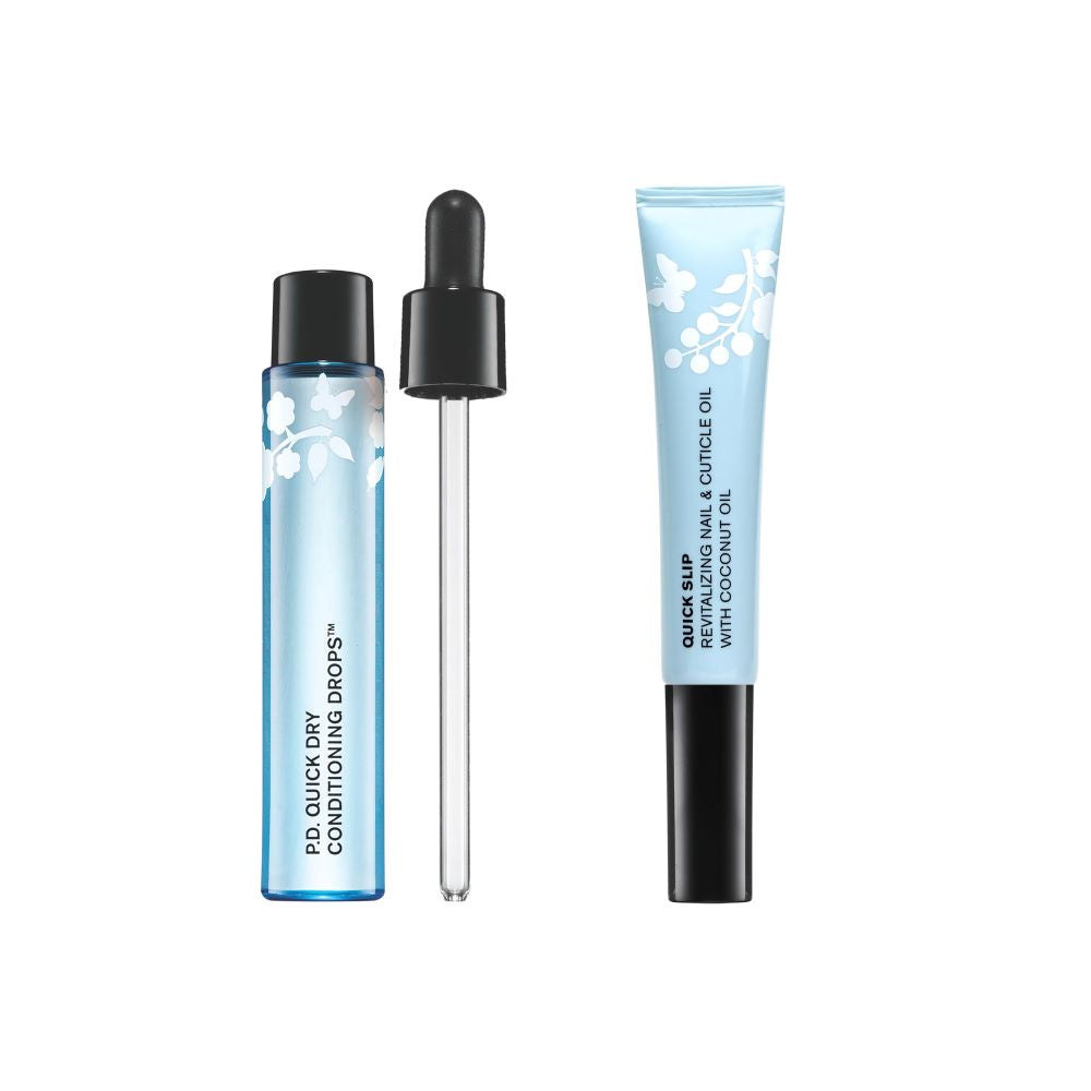 Achieve perfectly polished nails faster while keeping your cuticles deeply nourished. This duo combines the fast-acting P.D. Quick Dry Conditioning Drops to speed up drying time, with the ultra-hydrating QuickFix Moisturizing Cuticle Balm for smooth, healthy-looking cuticles.