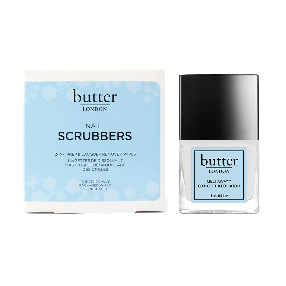 - Melt Away: 1. Shake the bottle and brush an even layer of Melt Away Cuticle Exfoliator around the cuticles and nail beds. 2. After approximately 60 seconds, gently push back the cuticles with our Signature Glass Cuticle Pusher (not included) or your thumb if you do not have a cuticle pusher handy. 3. Remove excess product with Nail Scrubber 2-in-1 Prep & Lacquer Remover Wipe, nail polish remover and a cotton pad (not included), or a small hand towel to avoid excess water on the nail. 4. That’s it! Follow with your favorite butter LONDON nail treatment or Patent Shine 10X Nail Lacquer (not included) for a salon-worthy mani.